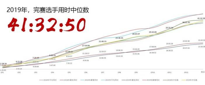 2019年与2018年168组别完赛选手的平均用时与中位数均相差无几,2018年完赛选手用时中位数为42小时38分,2019年则为41小时32分,用时缩短近一小时。
