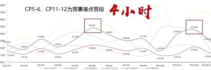 波峰代表该赛段,相较而言,所有选手耗时都较长,而波谷则意味着大家喜闻乐见的下坡或平路居多。从图中走势可以看出,2019年时,CP1-CP5,整体耗时处于上升阶段,比赛难度逐步增加,从CP4至CP6分段用时不断增加,其中CP5-6则达到比赛分段用时的最高峰,CP5-CP6是所有人都耗时最长的一个赛段,平均耗时4小时47分,最快选手用时2小时24分,亦为最快选手各段耗时中用时最长的赛段,这个赛段为全程距离最长的赛段,长达17.4公里,爬升700米;而CP5至CP10,整体用时处于下降态势,CP5的关门时间为24小时,理论上所有完赛选手在CP5之后都将进入比赛下半程。虽然处于下降态势,但并不意味着这一段会相对简单,从CP5-CP10,平均用时均为3小时+,且体力经过一天的消耗,已损耗过半,体能和意志均面临较大考验;而CP11-CP12则是第二高峰,平均耗时4小时32分,该路段全长15.5公里,爬升550米,且位于赛程最后,前期体力的极大消耗与较长的赛段叠加,进一步放大了此段的难度,用时最快选手亦耗费了2小时09分才得以通过;平均用时排名第三的赛段则要归属CP10-CP11,平均用时3小时55分,此赛段距离12公里,爬升479,下降593,下降多于爬升,这从最快选手用时也可以看出,最快选手仅用时1小时07分便通过了此赛段。总体而言,CP9-CP12为整条赛道耗时最久的区域,这一段距离和爬升都占全程的五分之一,其难度并不突出,其耗时长多因为选手到此段时体力多已消耗殆尽,但通过此段便已完赛无忧,可谓黎明前的黑暗。