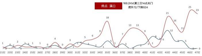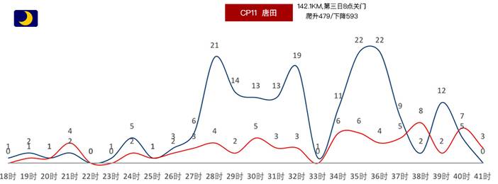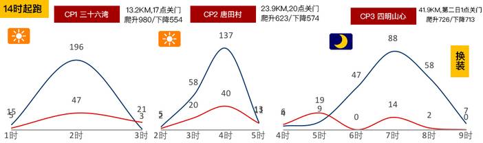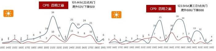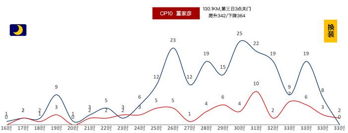 右图:CP9位于123.5公里处,累计爬升5674。选手到此站点时间明显呈现三个高峰。第一个高峰时间出现在开赛24小时时,亦即比赛日第二日的14时;第二个高峰时间出现在开赛27小时后,亦即比赛日第二日的17时,少部分选手抵达此处时已为比赛日第二日的20时。越到赛程后期,选手的体力、意志力均会出现较大差距,耗时、速度亦随之呈现较大差距。不少选手从此站点开始,要面临比赛日第二个夜晚的艰巨挑战,长时间的睡眠严重不足,不仅导致体力的下降,亦会带来精神的恍惚与意志的衰退。最后抵达此处的选手耗时33小时+,为第二日夜间23点后,领先关门时间近2小时。