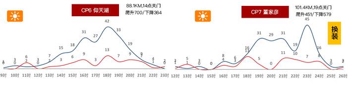 左图:CP6累计爬升4006。单段爬升700,在单段爬升中排第二。大部分选手于开赛第二日早上6-9点时抵达此处。刚刚结束了比赛日的第一个夜晚,从上文亦可以看出,CP5-CP6是所有选手耗时最长的路段之一。选手在此段可以看到太阳喷薄而出,暖暖的阳光取代了皎洁的月光,重新照耀到选手身上,驱散寒冷,带走倦意。抖擞精神,重新投入第二个比赛日的战斗。