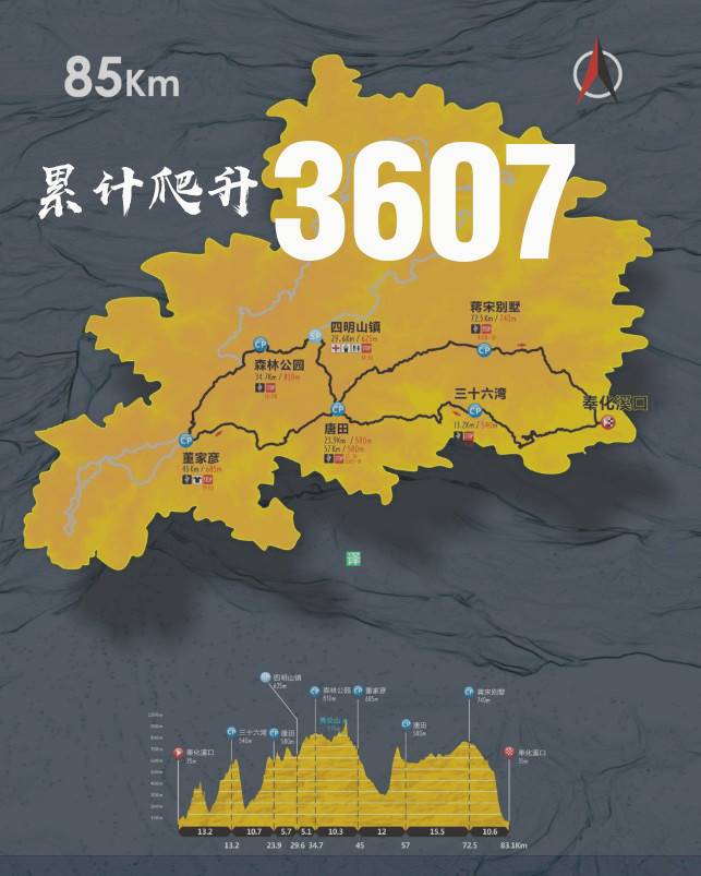 蒋宋别墅为所有组别在完赛前都要经过的CP点,不同于其它组别的苦苦煎熬方能抵达,85公里组别的选手多于比赛日当日24点前经过了此站点。而由此至终点仅有79爬升,而下降则多达824。无疑对于下坡技术更为出众的选手将更有优势。但要注意的是,夜间视线不佳,需注意跑动中落脚处,防止受伤。