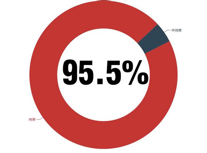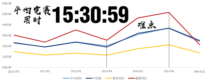 2019年度,男子冠军完赛用时13小时43分,女子冠军用时18小时40分,完赛时间在19小时内的仅有9人,占比3.9%;完赛用时在24小时以内的为84人,占比37%。近三分之二的选手,耗费了24小时以上的时间,完成了比赛。