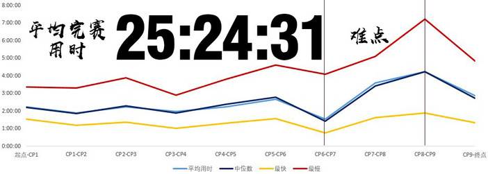 今年,完赛选手平均用时25小时24分31秒。因比赛距离为110公里,如果换算为百公里,则完赛时间为23小时左右,意味着可以在24小时内完赛。110公里组别31.5小时关门,选手平均完赛用时领先关门时间近6小时,选手完赛用时中位数为25小时37分40秒,与平均用时接近。较大幅度领先于关门时间,选手不用太过担心被关门,只需专注于完成好每一赛段的比赛。