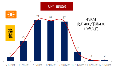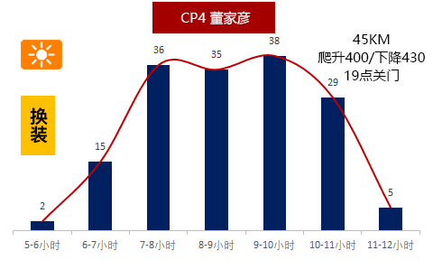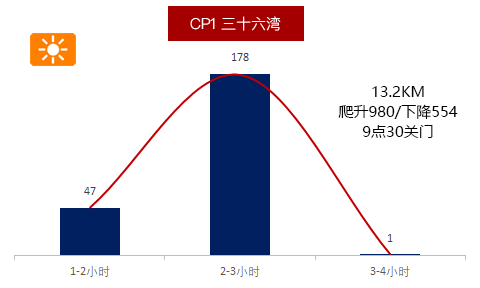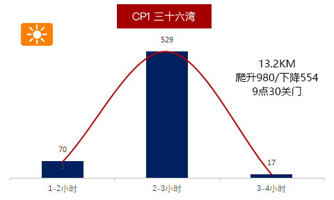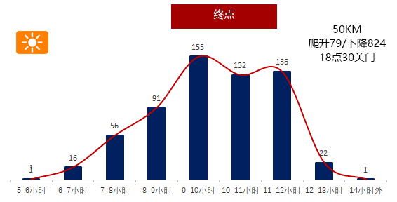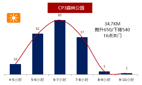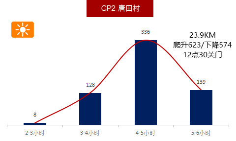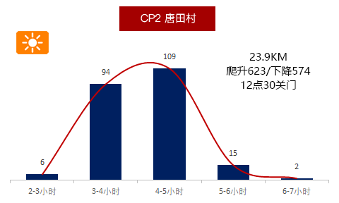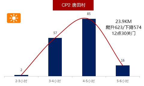 抵达CP2选手分布最密集的时间段为4-5小时,即10时30分至11时30分,而第二密集区间则属于11时30分至12时30分,领先关门时间并不多。可见前两个CP点仍具有一定难度,不可轻视。