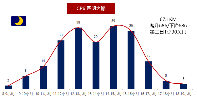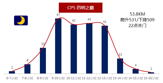 再次回到四明之巅时,赛程已过半。可能对于部分选手而言,体力已消耗殆尽,接下来更需要靠顽强的意志力和坚定的信念,支撑剩余的赛段。多数选手抵达此处时恰逢晚饭时间,可饱餐一顿,补充体力的同时,更好的迎接艰难的赛段。从前文可知,由CP6-CP9赛段,所有选手都呈现了用时大幅增加的趋势,主要是因为夜间行进,速度减缓,且体力消耗、视线受阻、夜间困倦等多种因素造成。