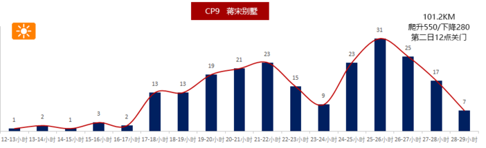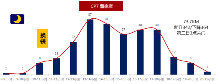 接下来,我们依旧踏上比赛的旅途,浏览每个CP点完赛选手通过用时的分布。110公里组别比赛于比赛日6时30分开赛,第二日14点关门,途中共设有9个CP点,2个换装点。对于这个距离的比赛而言,设置2个换装点是较为奢侈的,选手们可合理规划、充分利用两个换装点,以达到最大程度减重及快速及时补给的效果。