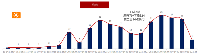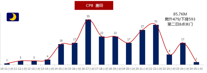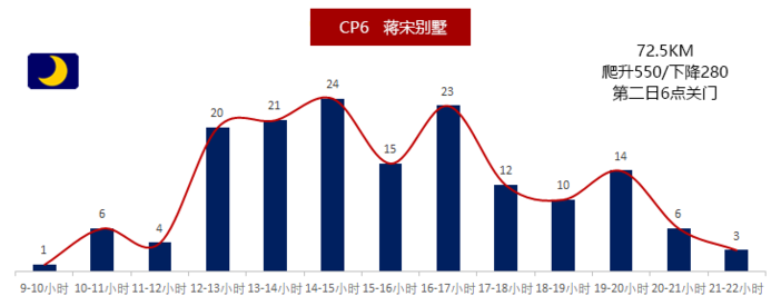 开赛10小时后(16点),CP5迎来了选手到达的高峰。此时选手已逐渐分化,9-13小时(即16点-19点间)每小时抵达此站点人数相仿。但对于大多数选手而言,由此便要告别白昼,转入夜战。