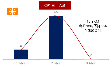 由CP1至CP2,便出现了选手用时的分化。3-4小时(即早9点30-10点30)与4-5小时(即10点30-11点30)抵达此CP点的选手数量大致相仿。
