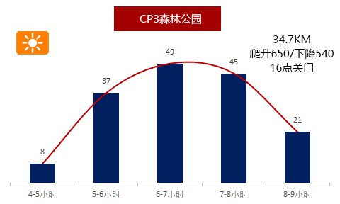 大部分选手抵达此站点的时间为中午12点30-13点30,经过了一上午的奔跑,恰逢中午可在此补充一些主食及碳水化合物等,补充消耗的能量与体力。且午间温度逐渐上升,应注意防晒降温。