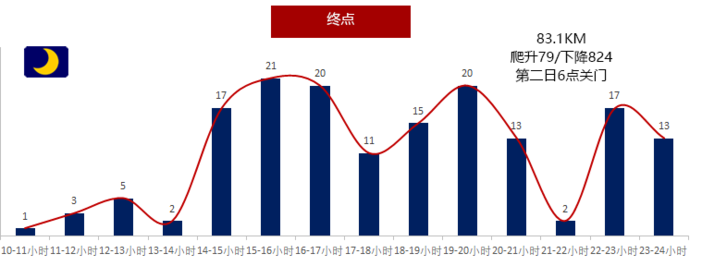 前文已经说过,85公里组别换装点的设置比较考验参赛选手的智慧。从分布图上可知,大多数选手抵达此处时间为13点30至16点30之间,而13点30抵达此处的选手,有望在24时之前完成比赛,无需准备过多御寒的衣物,可适当放置头灯、薄外套、一些能量补给品等;而16点30抵达换装点的选手则多要经过夜晚的洗礼才能完成比赛,这便意味着御寒保暖衣物是必不可少的。