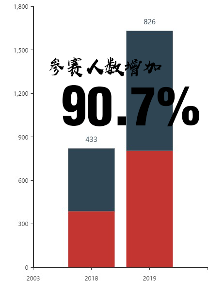 50公里比赛共有参赛选手826名,占比超过比赛全部选手的1/2,较2018年时增长90.7%。江南百英里参赛人数的飞速增长,亦是国内越野跑高度发展的缩影。