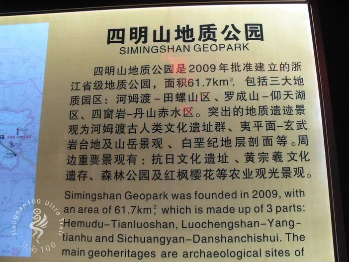 四明山地质公园拥有华东地区面积最大、保存最完整的古夷平面,总面积61.7 平方公里,主要地质遗迹面积就有26.66 平方公里。共分为三大区块,河姆渡古人类文化园区、四窗岩—丹山赤水地质园区、罗成山—仰天湖地质园区。这里有华东最大的夷平面及玄武石复合台地,从台地至峡谷的丰富地貌景观,保存了连续的白垩纪地层序列,也是欣赏浙江高位台地及湿地、突岩及石蛋、瀑布、泉水等地质景观的绝佳场所。