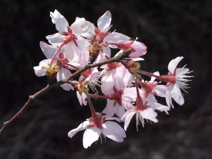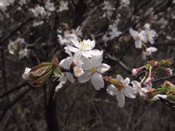 四明山上的野樱花不仅数量多,种类也十分丰富,据最近的调查研究表明,共有7个野樱花的种类:迎春樱、浙闽樱、大叶早樱、毛叶山樱花、山樱花、沼生矮樱、钟花樱等。