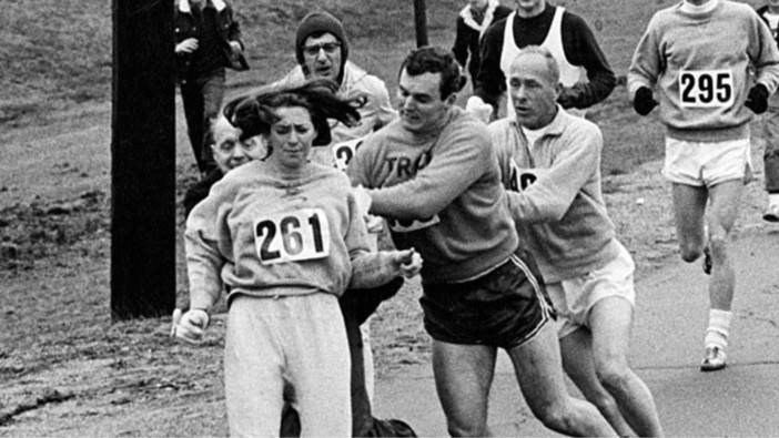 1967年,Kathrine Switzer在当时还不允许女性参赛的波士顿马拉松上, 越过试图阻挡她的赛事官员,以4小时20分的成绩结束比赛,刷新了历史。
