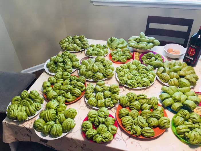 # 采摘艾叶制作的200多个艾叶花卷馒头 #