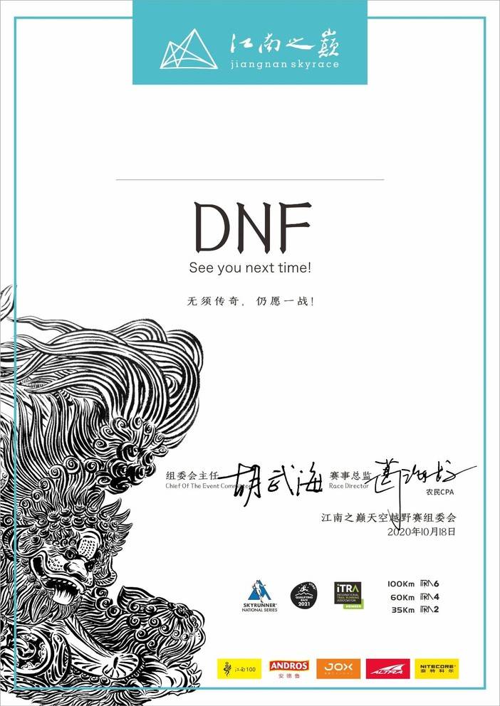 对于未完赛的选手,我们在cp点金龙村、均溪村、终点横溪村(最隆重在均溪,80K处)准备了“无需传奇·仍愿一战”江南之巅天空越野赛关门仪式,并现场颁发DNF证书。至于关门仪式的具体细节,暂且卖个关子,甚至,我们希望你永远不会知道。