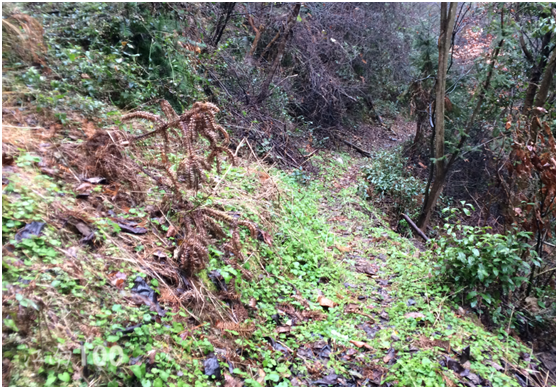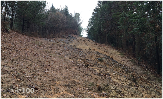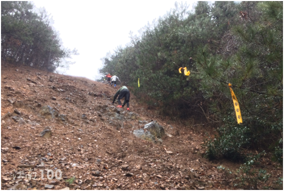 当我们还兴高采烈的跑在很平坦的小路上时,殊不知突然路标没了,回头一看左手边的路标,在看看上面爬坡的兄弟,真傻眼了。没错这是一个有着目测70度角左右防火道。加上下着下雨,略有一些湿滑,如果不小心可能会直接翻滚到山脚下了。所以作为真正比赛的选手后,千万要小心翼翼的往上爬了。而真正自己去爬的时候,确实要手脚并用了,发现并没有那么难爬,分分钟爬到兄弟的前面。爬上顶端往下看时,看着这防火道的坡度,这心里有一点小颤抖。不过有种爱上这样有挑战的防火道的感觉,越野就要野嘛。